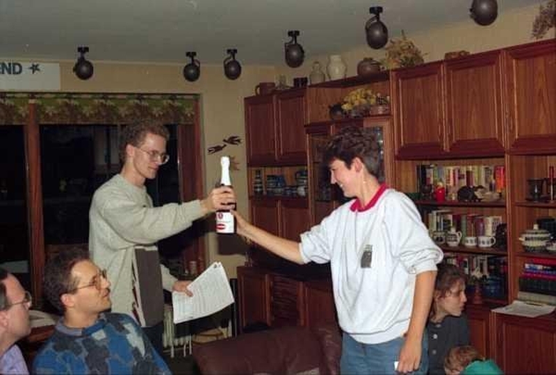 1991 - Patricia hat gewonnen - Jochen übergibt den Sekt
